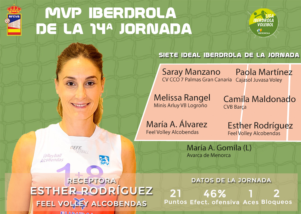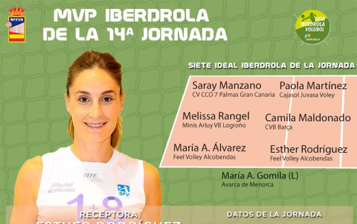 La jugadora Esther Rodríguez y toda la colectividad de Feel Volley Alcobendas se hacen acreedores del reconocimiento de MVP Iberdrola de la fecha 14 de competición. El conjunto madrileño consiguió el resultado más destacado de la jornada al batir a Fachadas Dimurol Libbys en cinco sets, un partido vibrante en el que destacó toda la escuadra alcobendense, liderada por su capitana Esther Rodríguez.