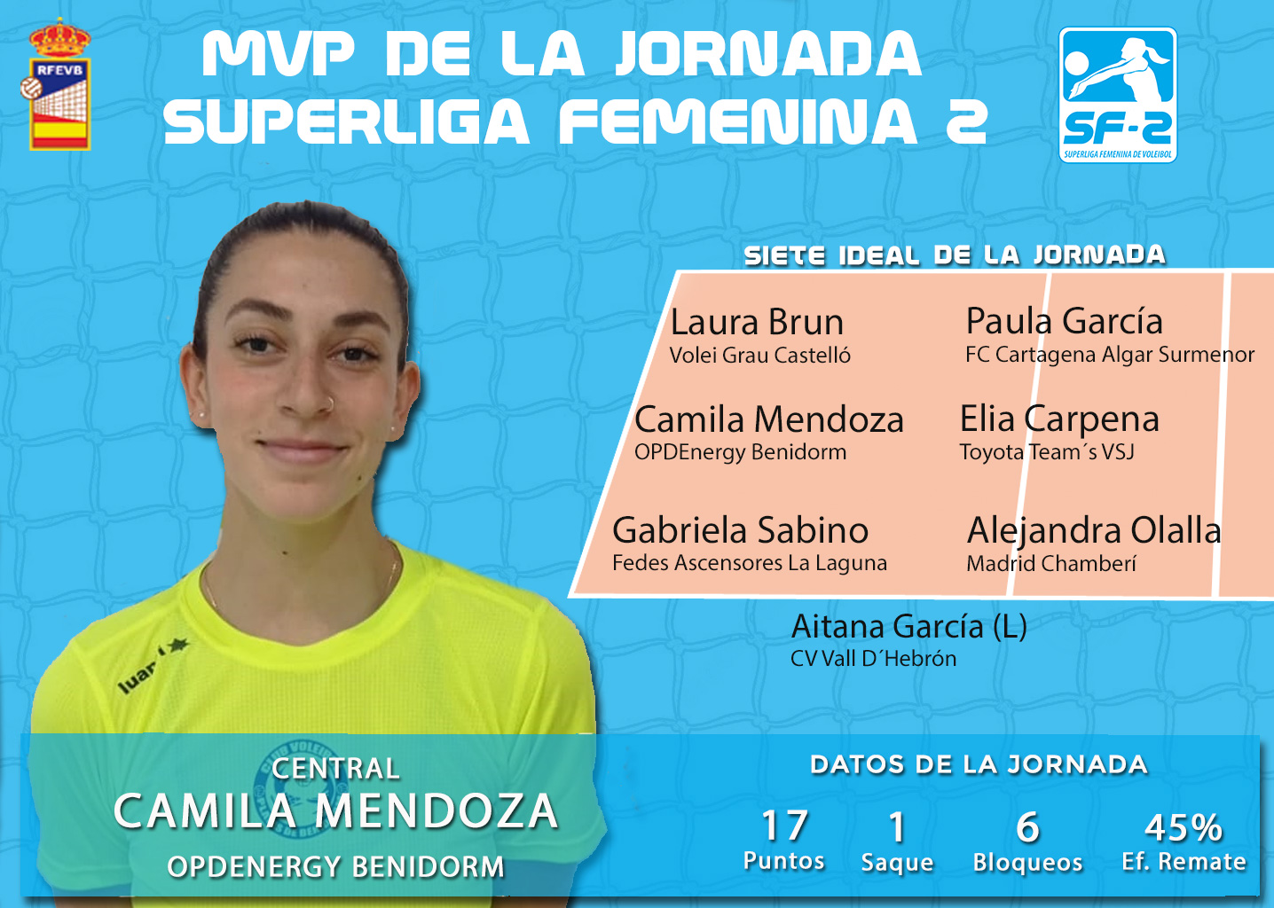 Junto al colocador Álvaro Costa, conforman el siete ideal de la 11ª jornada de la categoría de plata del voleibol masculino nacional los centrales Adrián Oliva y Anderson Grossi, de Cisneros Alter y Barça Voleibol, respectivamente, Guillem García de FamilyCash Xátiva VB en la posición de líbero, los receptores Igor Hernández y Rafael Albornoz, de Servigroup Benidorm y Cisneros Alter y el opuesto de Servigroup Benidorm Arnau Caparrós.