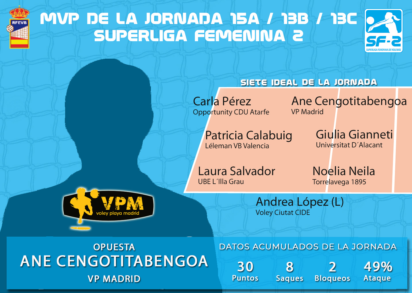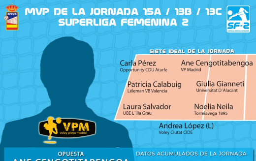 La opuesta de VP Madrid Ane Cengotitabengoa es la MVP de la 15ª jornada de la Superliga Femenina 2. La jugadora del conjunto capitalino fue decisiva en la victoria ante Autos Cancela Zalaeta que amplió la ventaja de las madrileñas al frente de la clasificación. Ane Cengotitabengoa sumó 32 puntos en cuatro sets, con siete puntos directos de saque y tres bloqueos para convertirse en la segunda máxima atacante, mejor sacadora y máxima anotadora del fin de semana.