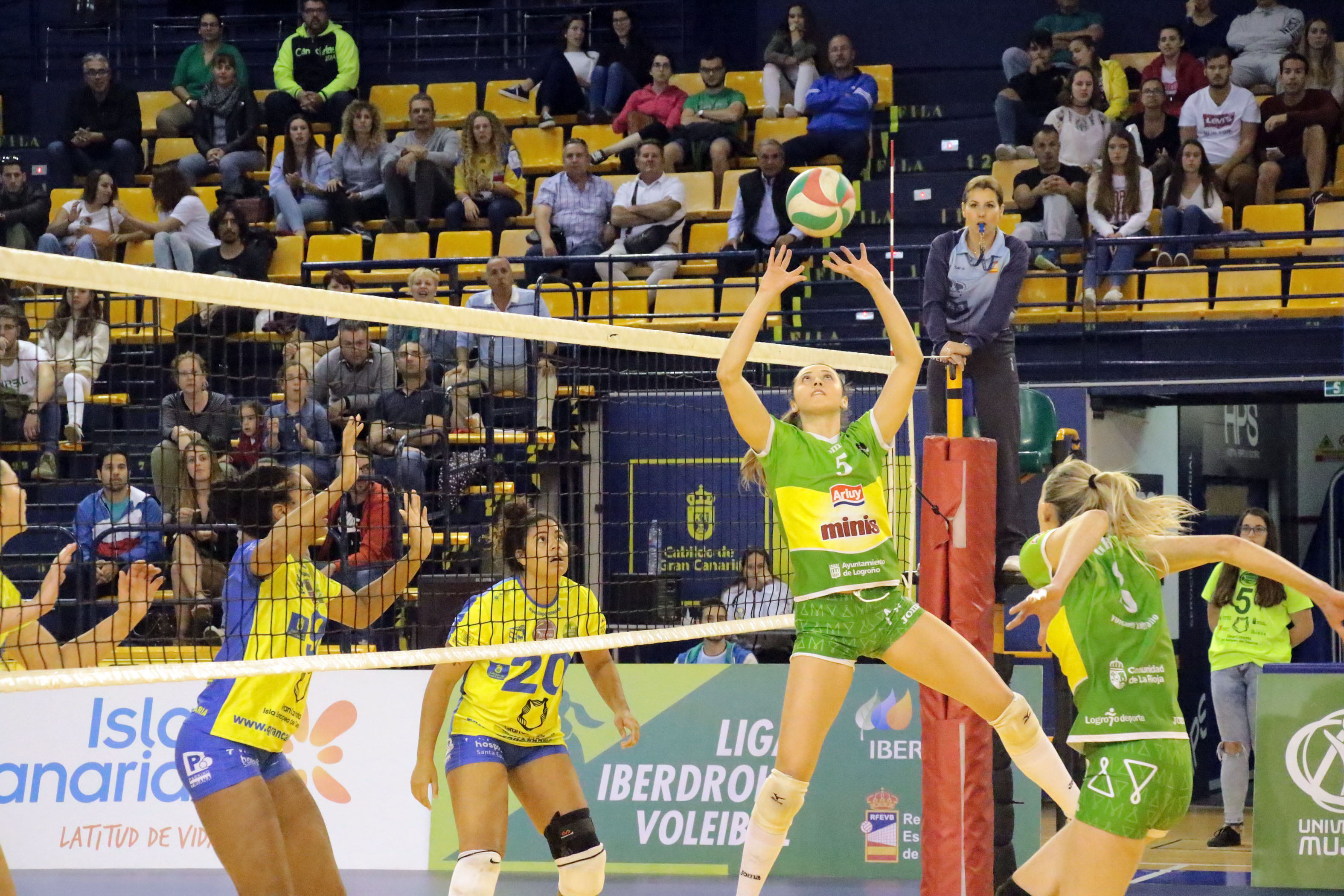 Un gran partido el realizado por el conjunto grancanario que doblegó en el primer set por un contundente 25-21 al Minis Arluy Logroño. En el segundo set, la veteranía demostrada en la cancha por las riojanas fue determinante para que éstas lograran la victoria por 25-20. Ya en el tercer set, a pesar del enorme esfuerzo del equipo de Sergio Miguel Camarero por frenar los ataques de las riojanas, varios errores en el saque grancanario y el poco acierto en los ataques por las puntas resultó favorable para los intereses del equipo riojano ganándolo 25-19.