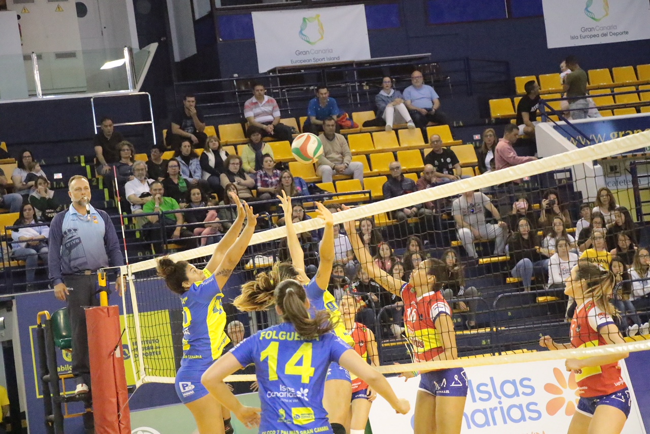 El encuentro empezó con equilibrio en el marcador para ambos equipos. Las jugadoras de Sergio Miguel Camarero plantaban cara a todo un campeón de liga con un saque regular y buenos ataques por las puntas gracias a las acciones de Saray Manzano y Naomi Santos-Lamb, lo que resultó determinante en el primer set para alcanzar un resultado favorable para el conjunto grancanario de 25-19.