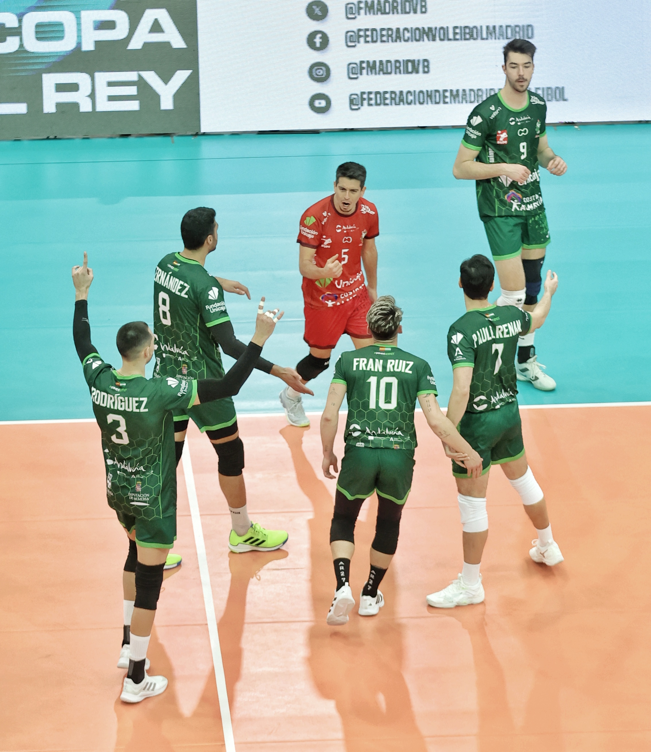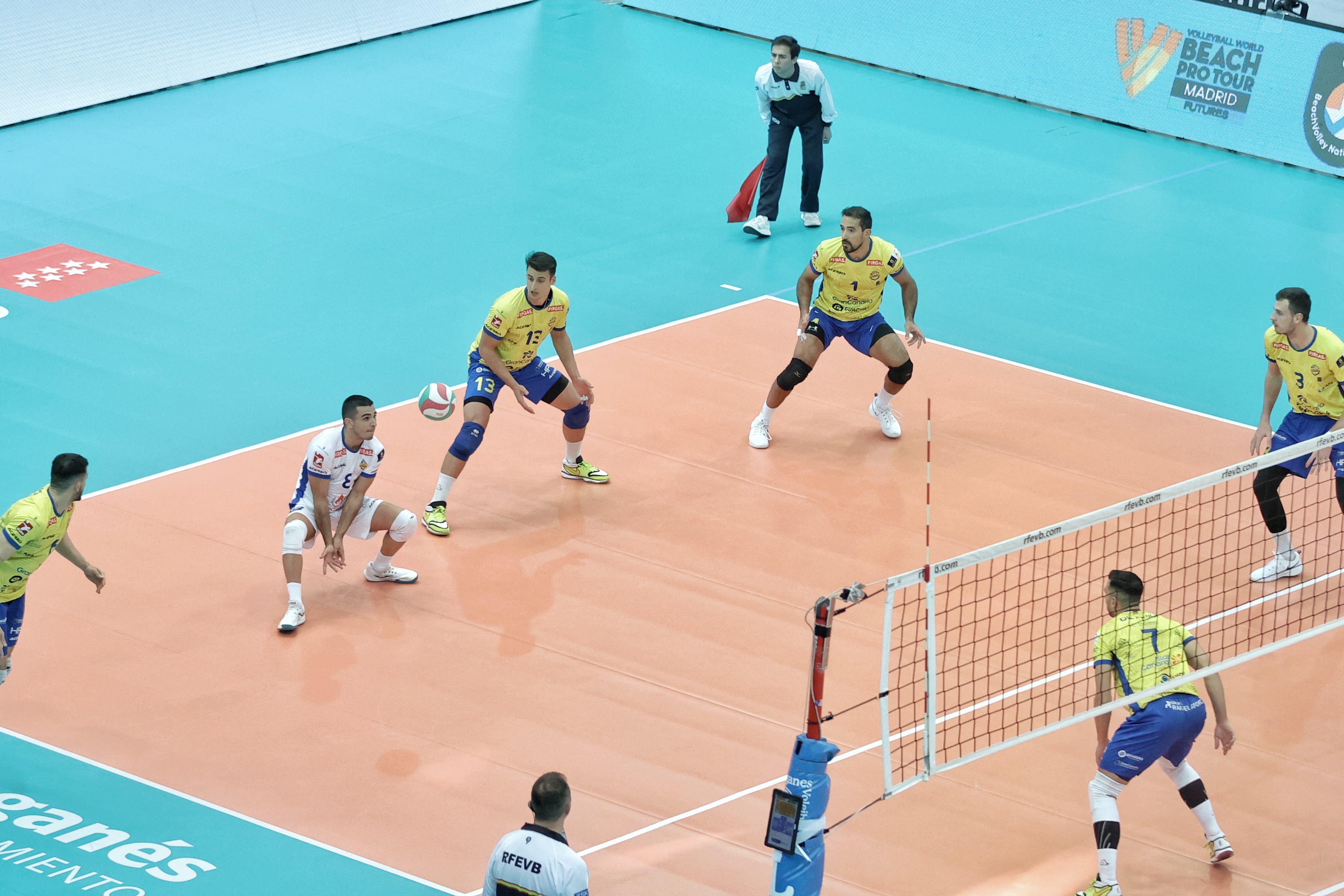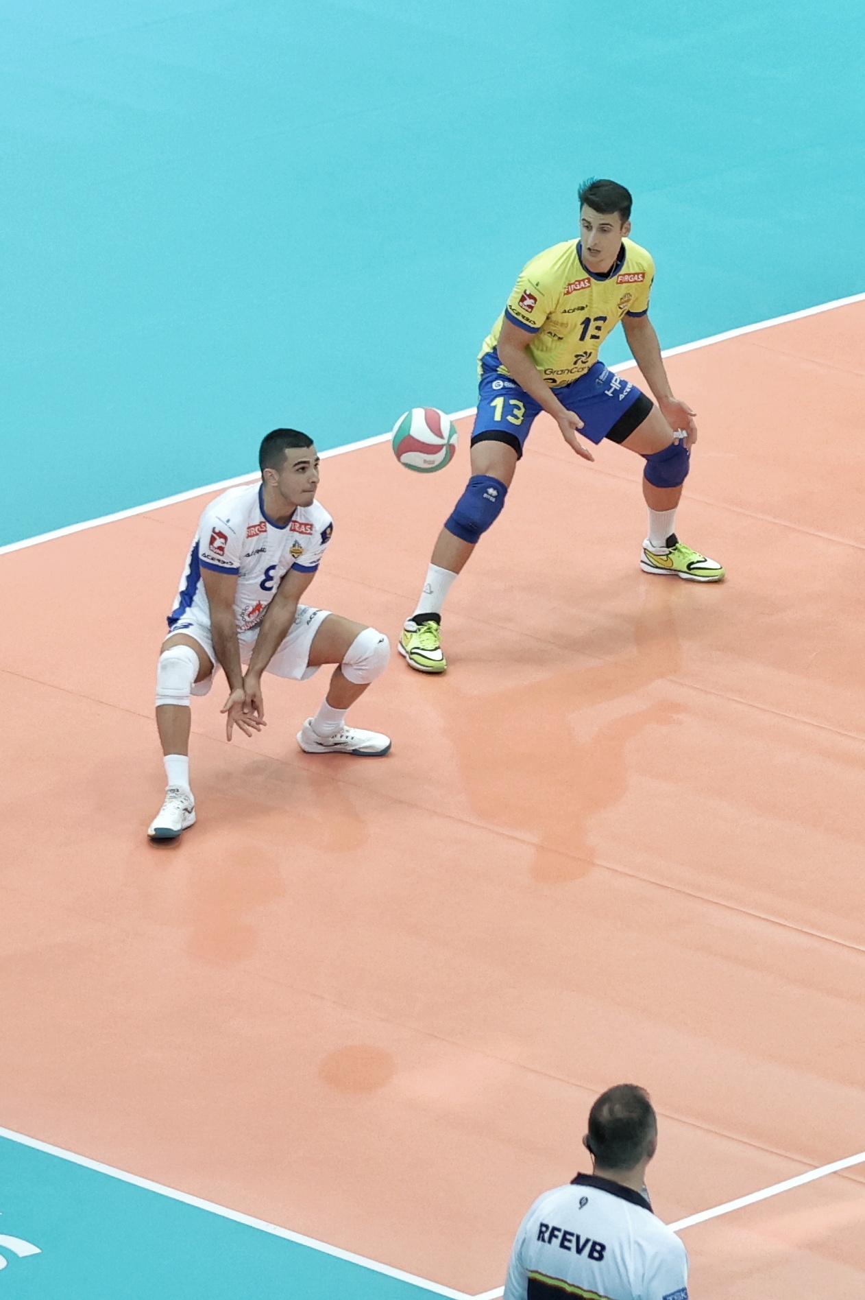El duelo entre los dos mejores conjuntos del torneo no defraudó. Desde el inicio, ambos rivalizaron en aciertos para intercambiar el control del marcador de un lleno Pabellón Europa. Cuatro mil espectadores que disfrutaban de la distribución de Miguel Ángel de Amo para los ataques de Nicolás Bruno, y del espectacular rendimiento ofensivo de Neaves y Fran Ruiz. El desenlace agónico estaba asegurado y los pupilos de Sergio Miguel Camarero tendrían las dos primeras oportunidades para sellar el primer set, algo que lograrían tras un remate del argentino Nicolás Bruno.