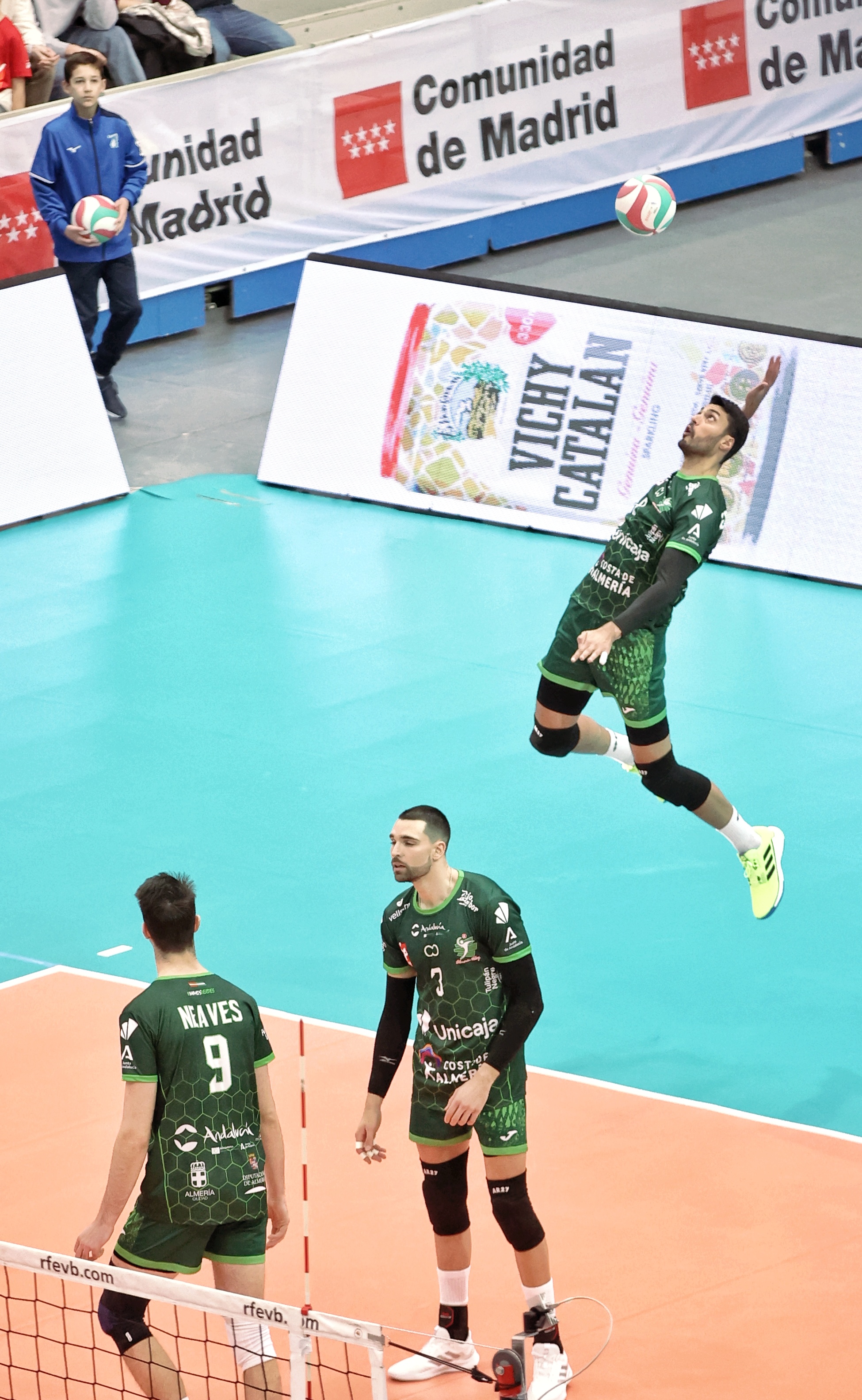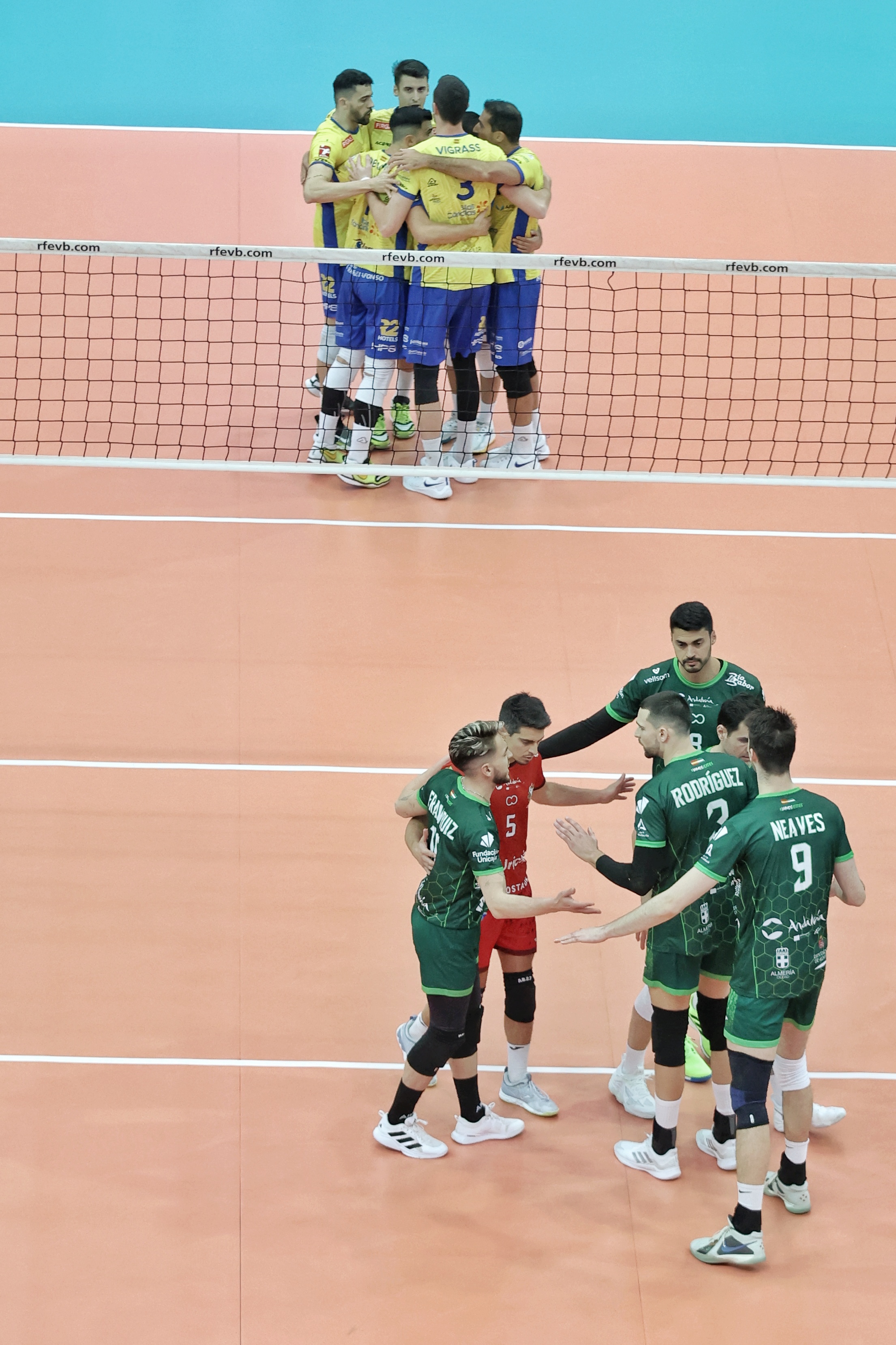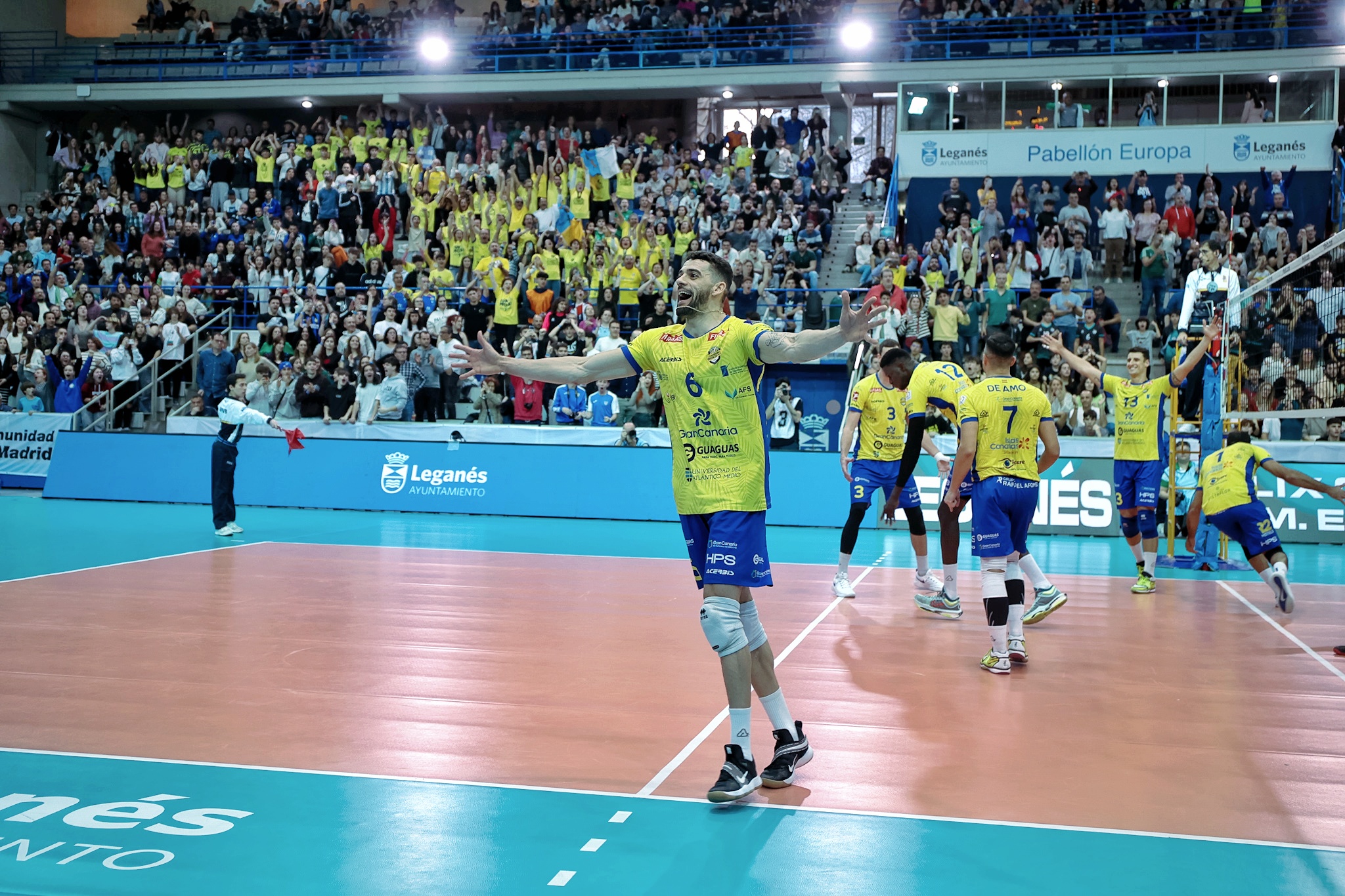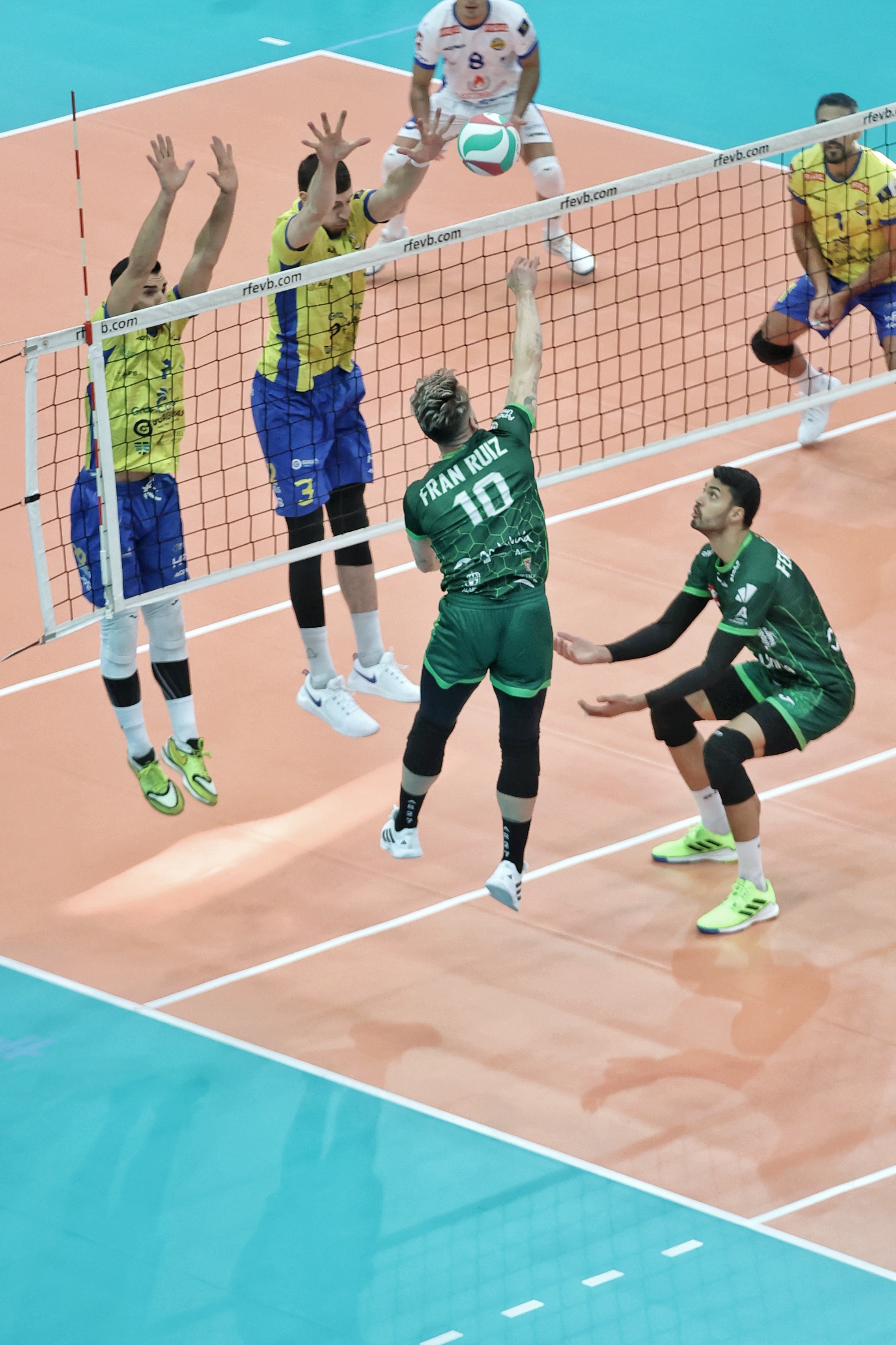 El duelo entre los dos mejores conjuntos del torneo no defraudó. Desde el inicio, ambos rivalizaron en aciertos para intercambiar el control del marcador de un lleno Pabellón Europa. Cuatro mil espectadores que disfrutaban de la distribución de Miguel Ángel de Amo para los ataques de Nicolás Bruno, y del espectacular rendimiento ofensivo de Neaves y Fran Ruiz. El desenlace agónico estaba asegurado y los pupilos de Sergio Miguel Camarero tendrían las dos primeras oportunidades para sellar el primer set, algo que lograrían tras un remate del argentino Nicolás Bruno.
