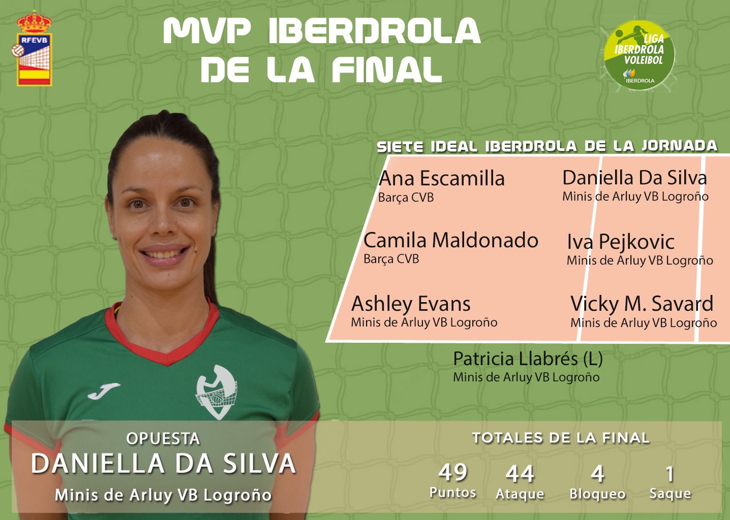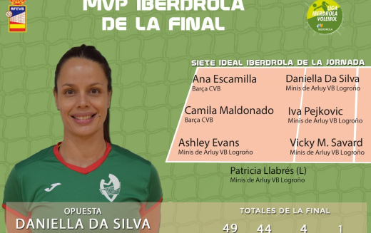 La opuesta de Minis de Arluy VB Logroño fue la máxima anotadora del partido al sumar 15 puntos, 3 de ellos en bloqueo, y contar con un 50% de efectividad en el ataque. Junto a ella, en el 7 ideal de la final de la Liga Iberdrola, también están las jugadoras del conjunto riojano, Iva Pejkovic y Vicky M. Savard; la central fue la máxima anotadora en esa posición al lograr 5 bloqueos, mientras que la receptoras aportó 12 puntos a su equipo, 2 de ellos de saque directo, además de lograr un 68% de recepción.