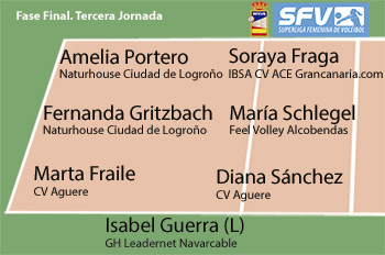 Los dos puestos de centrales son para Fernanda Gritzbach, de Naturhouse Ciudad de Logroño y María Schlegel, de Feel Volley Alcobendas. Ambas jugadoras sumaron tres bloqueos en sus respectivos encuentros. Por su parte, el puesto de líbero es para Isabel Guerra, de GH Leadernet Navarcable, tras su acertada actuación en el 3-0 de su equipo, mientras que Marta Fraile, de CV Aguere se hace con la posición de colocadora, después de dirigir con inteligencia a su equipo en la victoria sobre CVB Barça y sumar 5 puntos, 2 aces, 1 bloqueos y 47% de efectividad ofensiva colectiva.