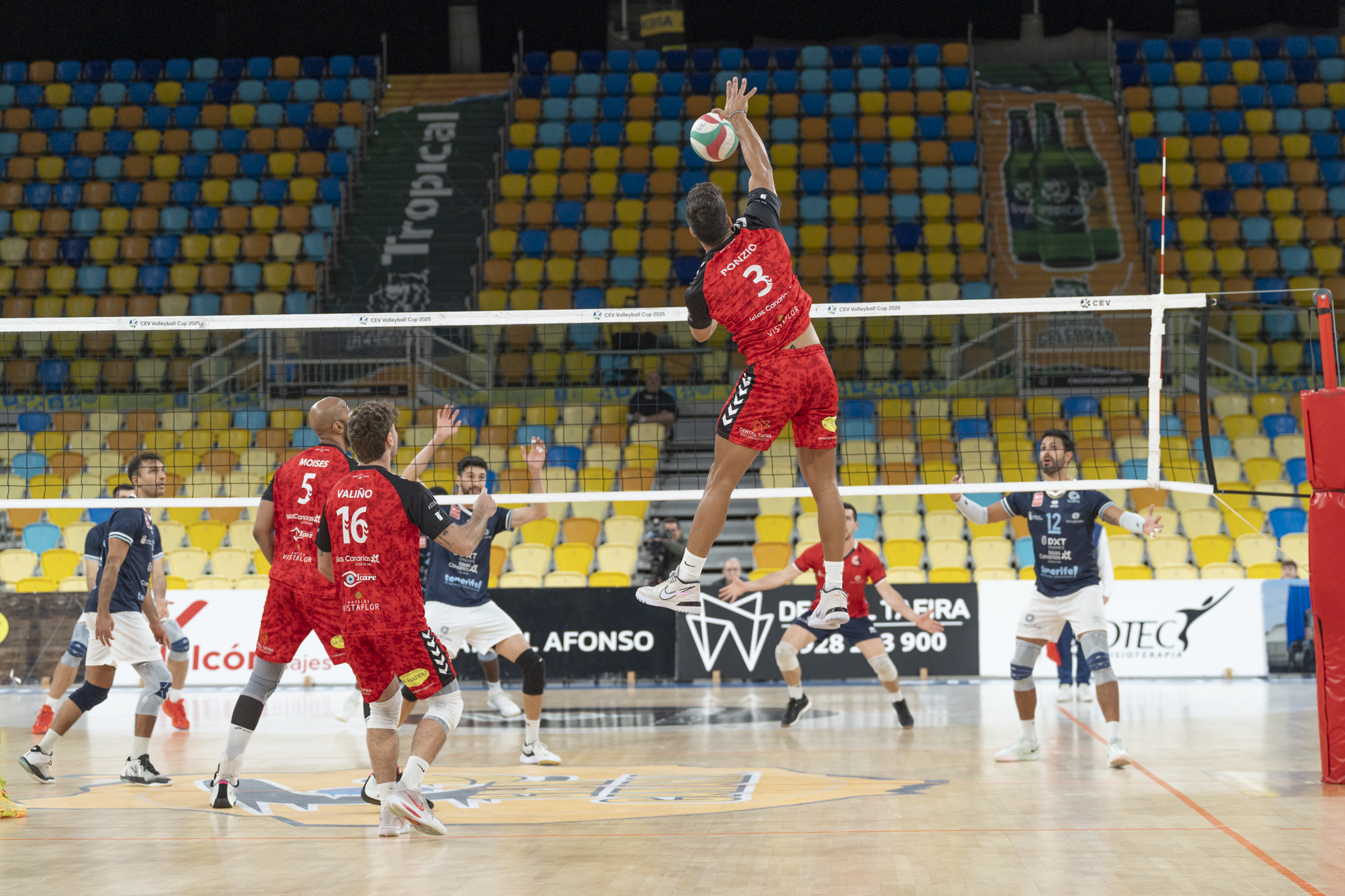 Todo intento rojinegro se topaba con una respuesta de un Cisneros que encontraba en Flores y Duque los puntos necesarios para cerrar la tercera manga con un 17-25, que le daba a los tinerfeños la victoria por la vía rápida (0-3).