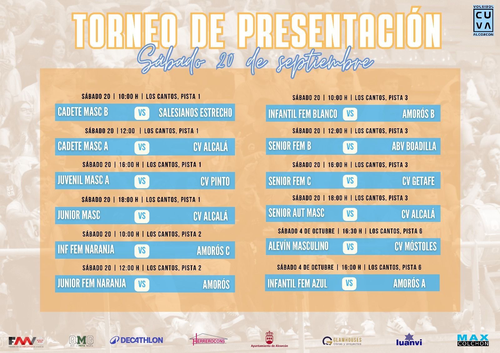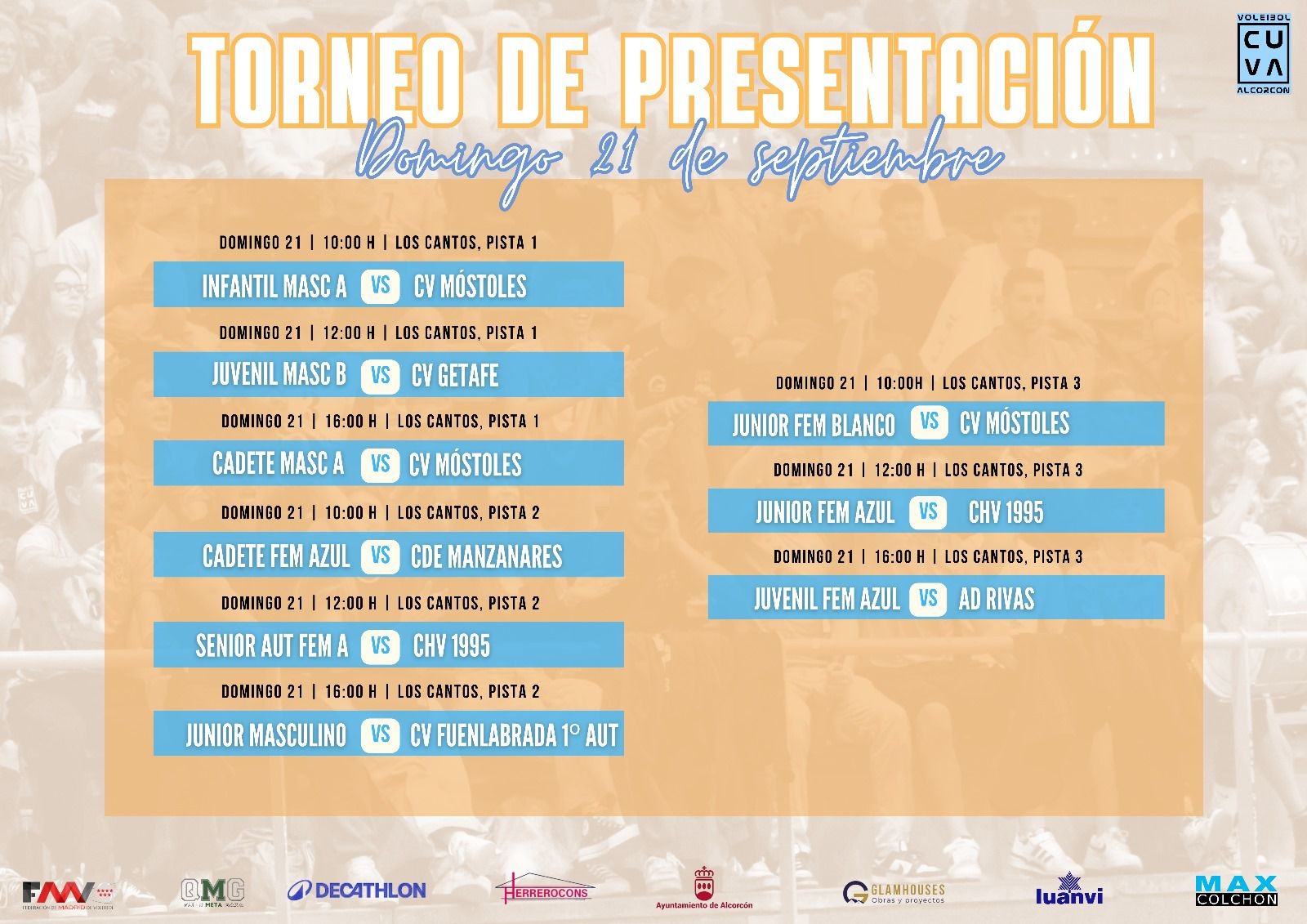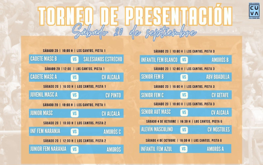 El Club Unificado Voleibol Alcorcón (CUVA) celebra este fin de semana, 20 y 21 de septiembre, su Torneo de Presentación en el Polideportivo Municipal Los Cantos, donde la gran mayoría de los equipos federados del club se medirán en encuentros amistosos ante diferentes rivales madrileños.