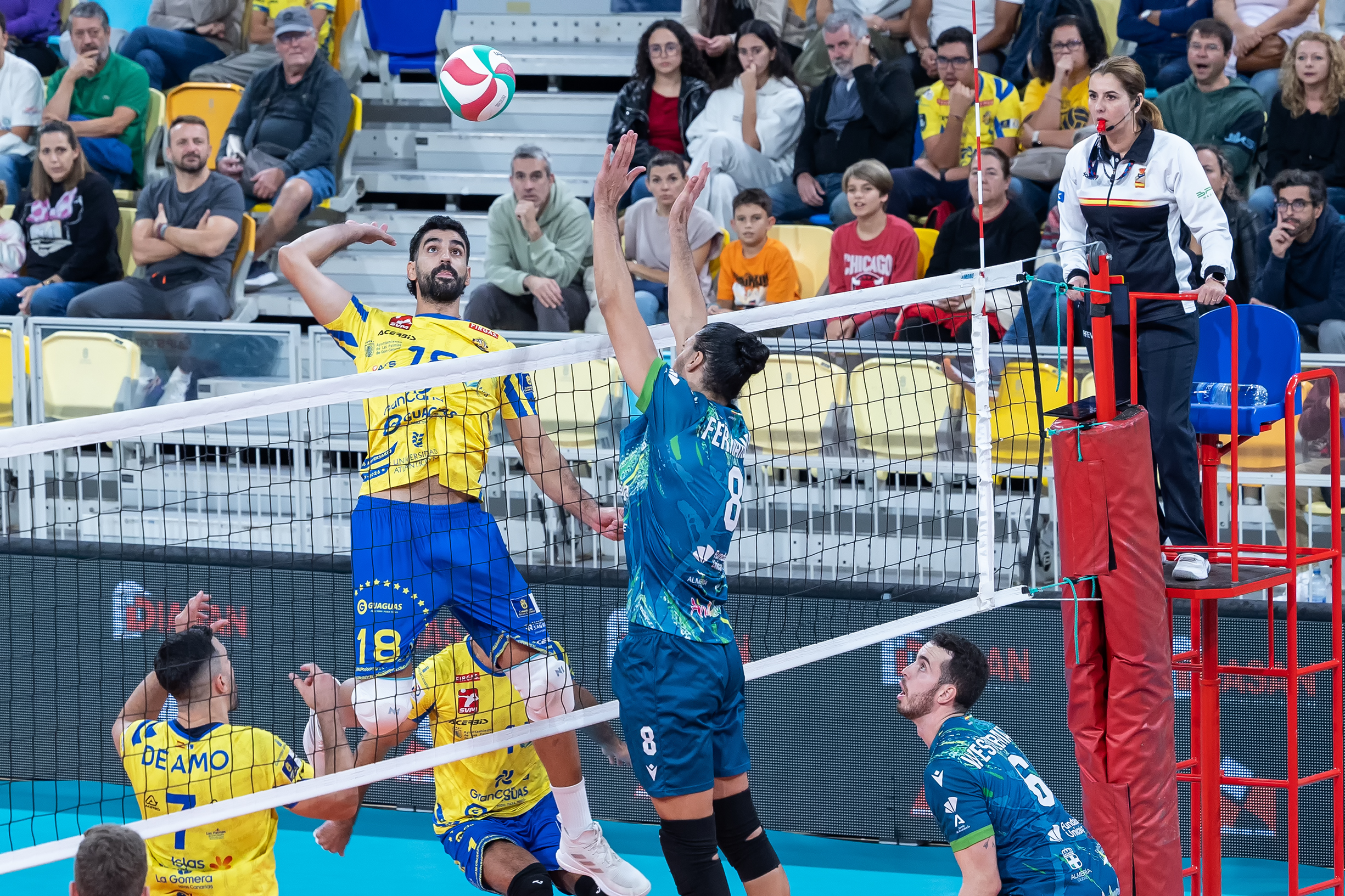 En el segundo set, el equipo de Sergio Miguel Camarero aceleró el ritmo y llevó la iniciativa desde el principio. Aunque Almería construyó un muro defensivo que exigió a Walla, Hélder y compañía a encontrar soluciones imaginativas. El Guaguas se mantuvo firme, ordenado y muy eficaz en ataque, y resolvieron el parcial por 25-19.