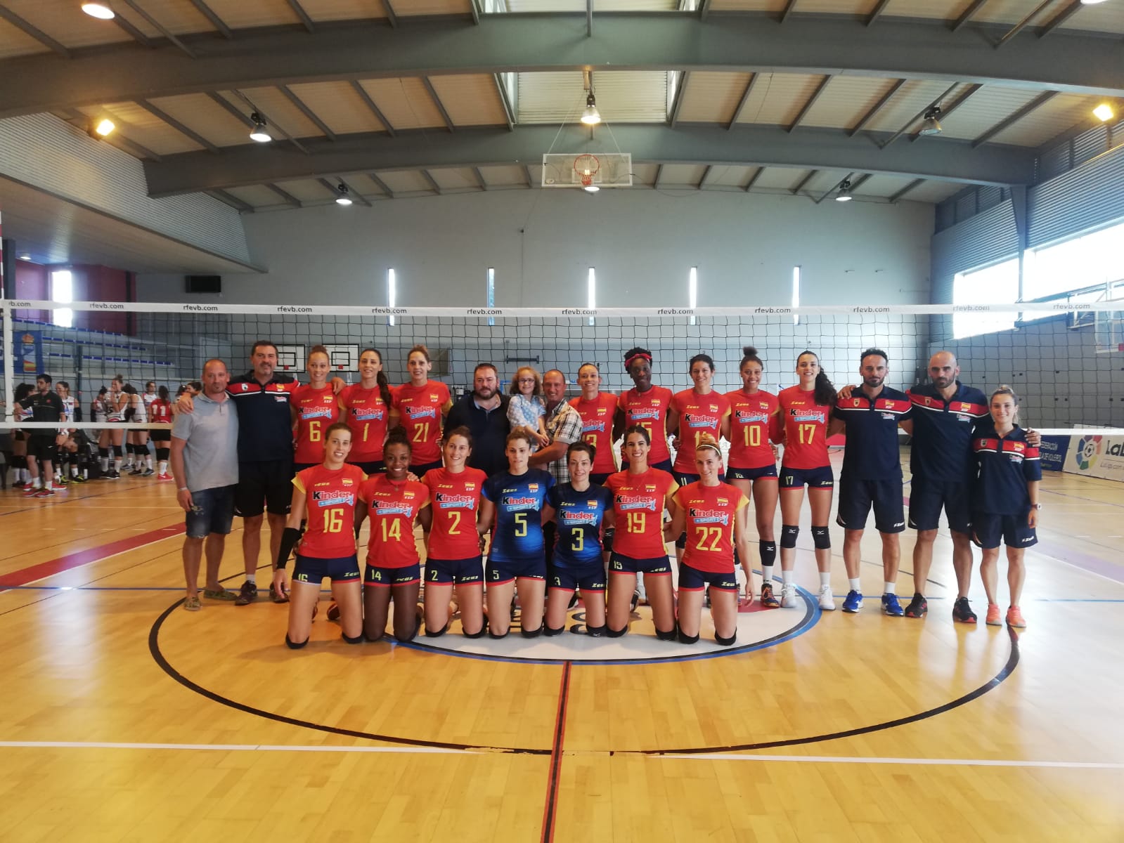 España arrancó el partido con mucha eficacia en ataque apoyada en el acierto de Milagros Collar, Helia González y María Segura. Con el aporte ofensivo el primer set cayó del lado nacional, pero vio como en el segundo parcial, Portugal mejoraba en sus acciones de ataque impidiendo que las jugadoras de Pascual Saurín continuasen sacando rédito de su acierto en el saque. La igualdad se rompería en el tercer set, con el acierto de la selección femenina en un emocionante final que cayó del lado español gracias a los puntos de Ana Correa y la capitana Helia González. El cuarto set sería igual de equilibrado en el marcador del Pabellón Alonso Rodríguez de Noia que el anterior pero con desenlace diametralmente opuesto, con una mala finalización del set por el bando español que permitió a Portugal forzar el desempate.