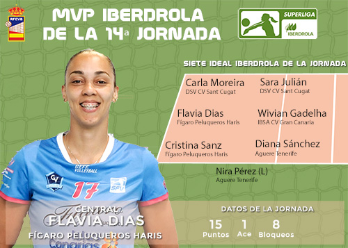 La jugadora de Fígaro Peluqueros Haris Flavia Dias es la MVP Iberdrola de la jornada. La central brasileña brilló con luz propia en uno de los encuentros destacados del fin de semana en la Superliga Iberdrola, el duelo de rivalidad regional entre Fígaro Peluqueros Haris y Aguere Tenerife.