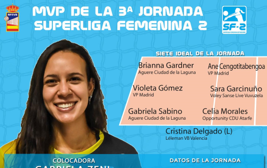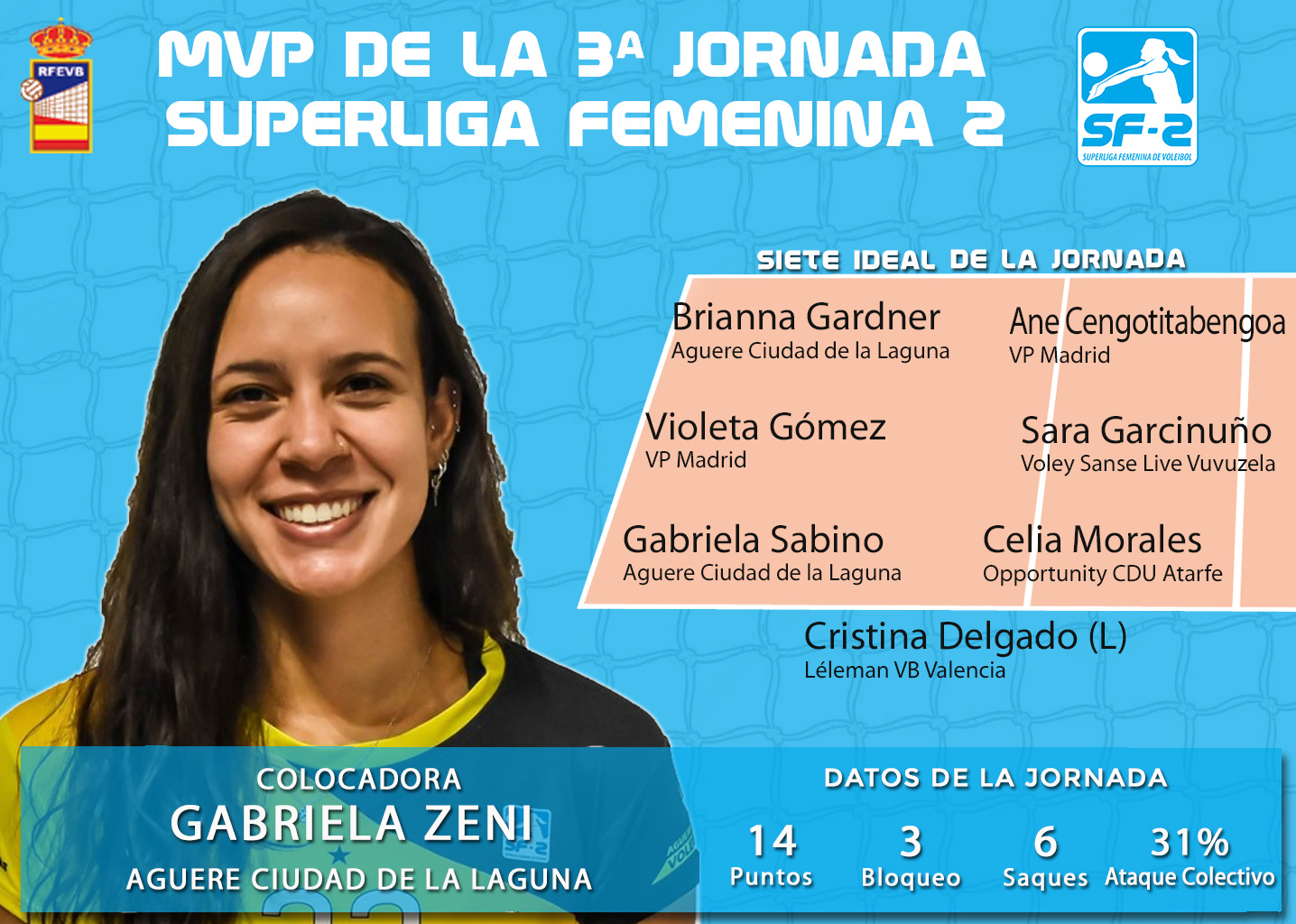 La colocadora de Aguere Ciudad de La Laguna Gabriele Sabino es la MVP de la tercera jornada de la Superliga Femenina 2. La brasileña se erigió en la más destacada del fin de semana al llevar a su equipo al triunfo con 14 puntos, seis de saque y tres en bloqueo que además le permitió ser la máxima sacadora de la jornada. Su compañera de equipo la estadounidense Brianna Gardner ocupa uno de los roles de receptora en el siete ideal de la jornada, gracias a sus 25 puntos, 19 en remate, 3 saques y 3 bloqueos, además de un 57% de efectividad en recepción.
