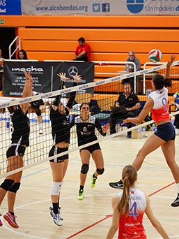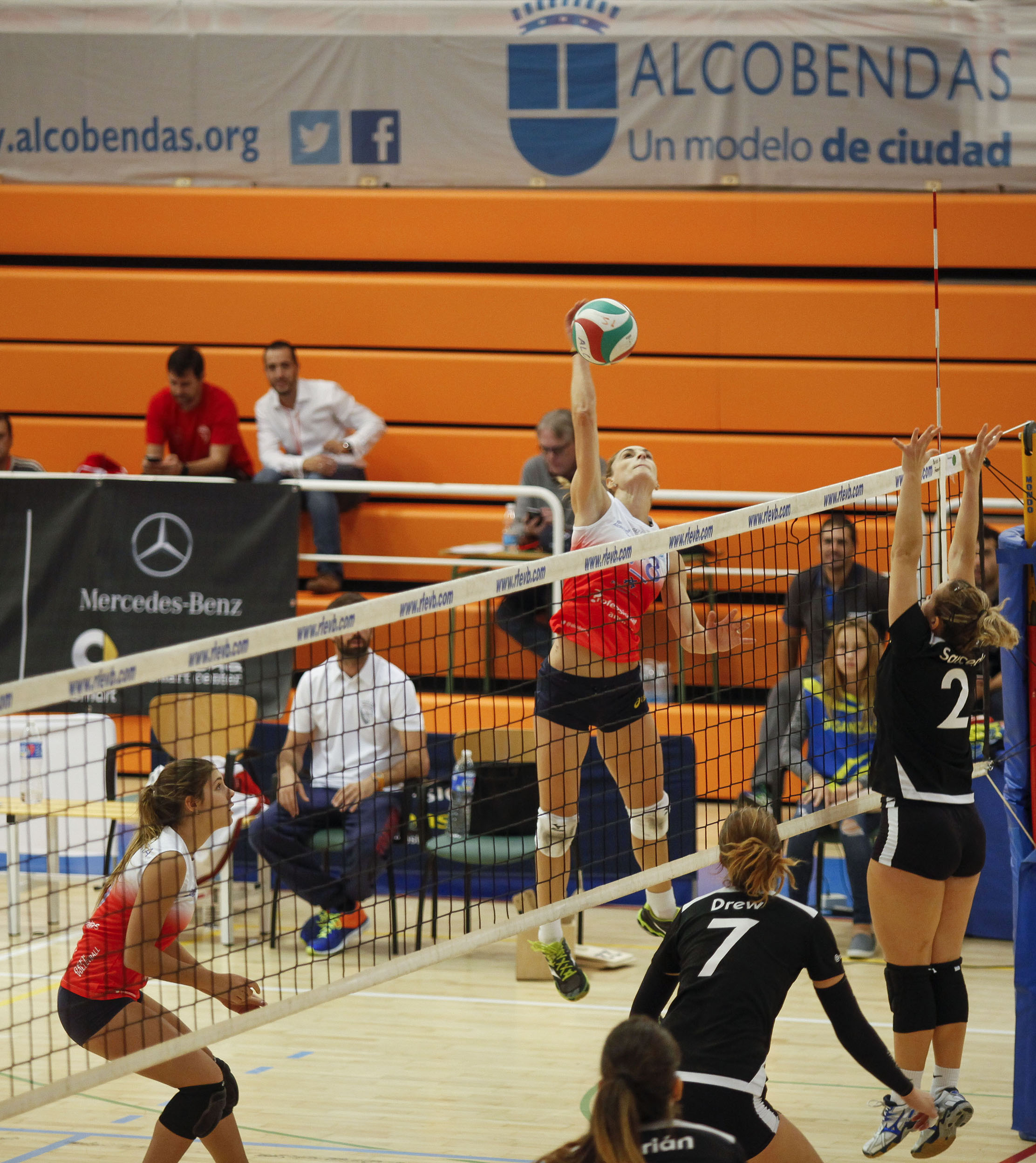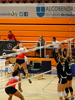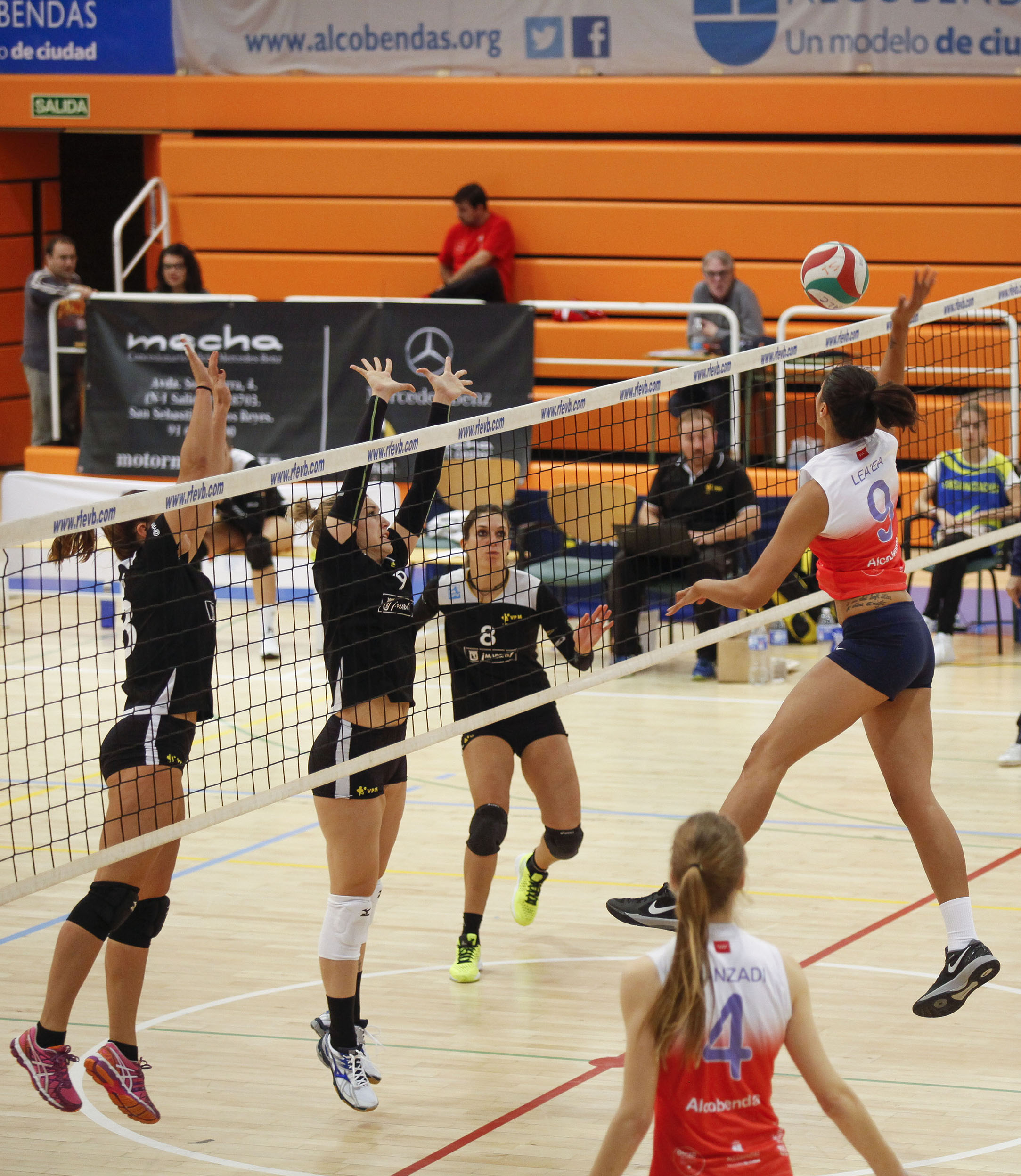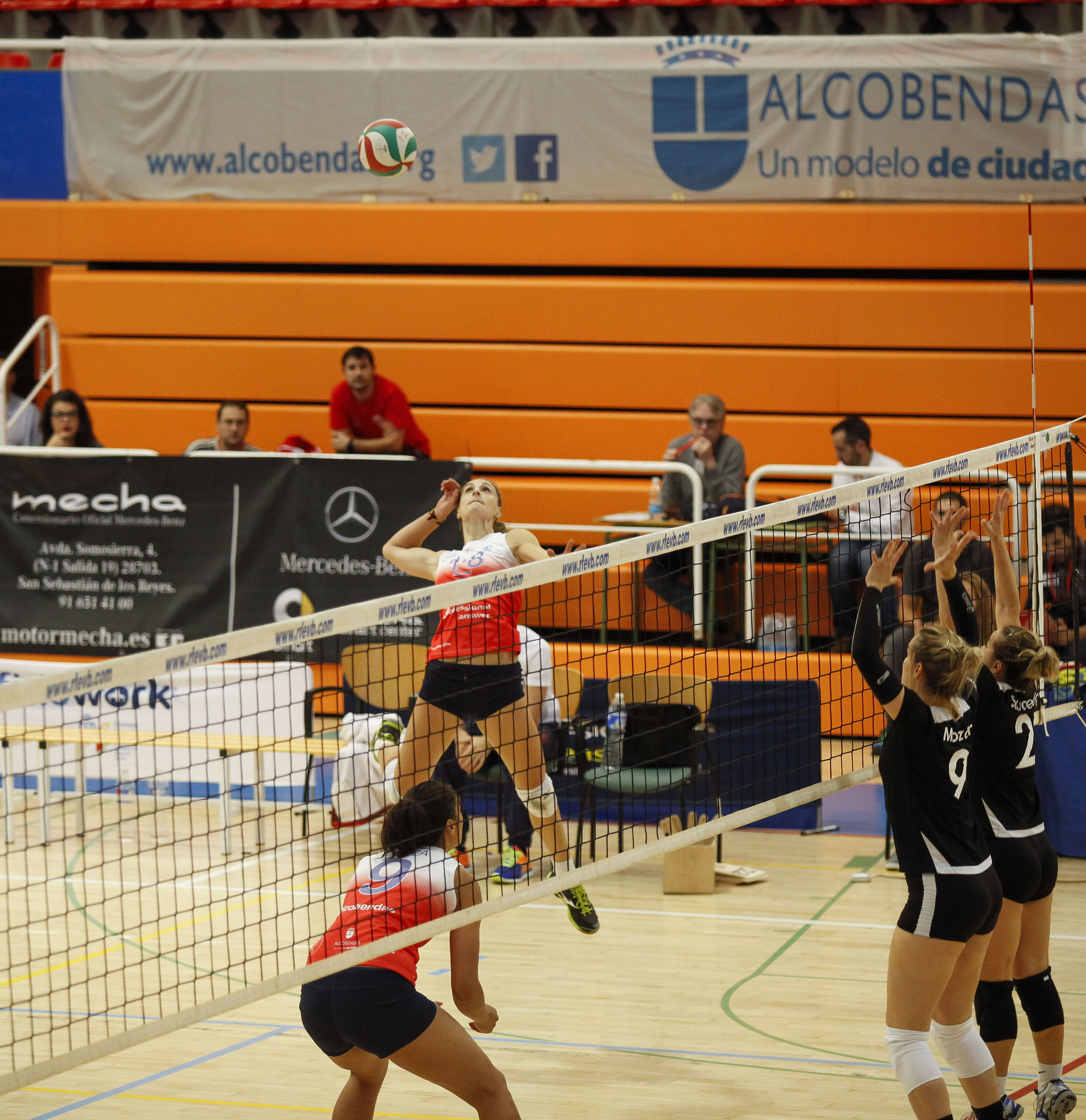 Feel Volley Alcobendas - VP Madrid La debutante Tessa Leaea rematando ante el bloqueo madrileño aún formándose