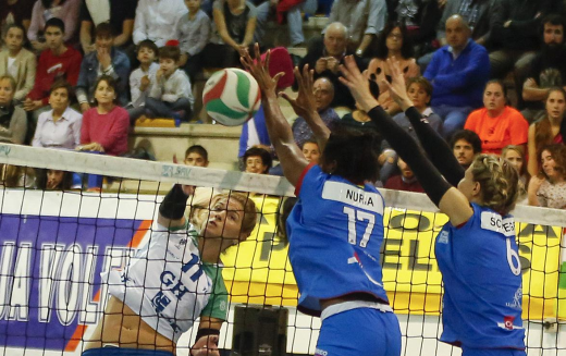 Haro Rioja Vóley - GH Leadernet Navarcable Brankica Nikic superando el bloqueo de Nuria Lopes y María Schlegel Foto Carlos Moral