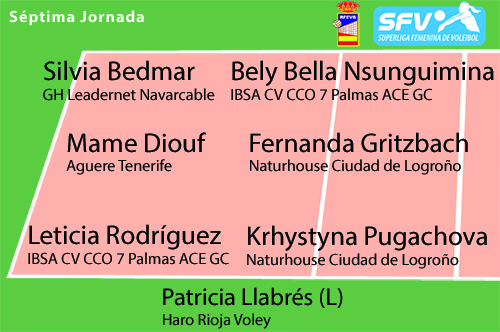 completa el siete ideal en el puesto de líbero, mientras que el resto de clasificaciones individuales de la jornada están lideradas por Sofía Elizada (Feel Volley Alcobendas), que junto con Silvia Bedmar (GH Leadernet Navarcable) copan el primer puesto de mejores sacadoras de la jornada, y por Celia Bedmar (Haro Rioja Voley) que encabeza la lista de receptoras.