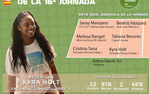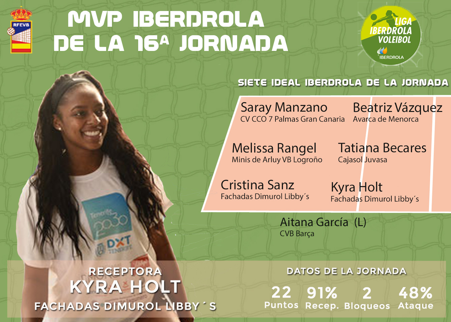 La jugadora de Fachadas Dimurol Libbys Kyra Holt se convierte en la MVP Iberdrola de la decimo sexta jornada de la Liga Iberdrola. La espectacular remontada de su equipo, Fachadas Dimurol Libbys en su visita a Cajasol Juvasa, estuvo marcada por el excepcional rendimiento de la receptora norteamericana que lideró a las tinerfeñas para mantener la segunda plaza.