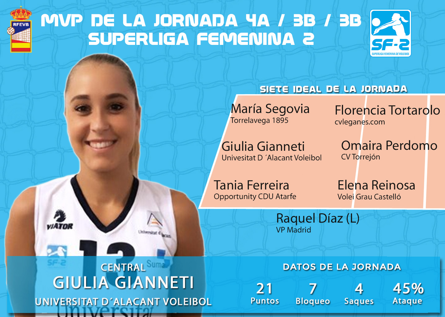 El segundo puesto de central lo ocupa Omaira Perdomo de CV Torrejón, clave en la victoria con remontada de las madrileñas en su visita a CV Sestao. Los puestos de receptoras son para María Segovia de Torrelavega 1895 y Elena Reinosa de Volei Grau Castelló. La líbero de VP Madrid Raquel Díaz completa el siete ideal del cuarto fin de semana de competición en la Superliga Femenina 2