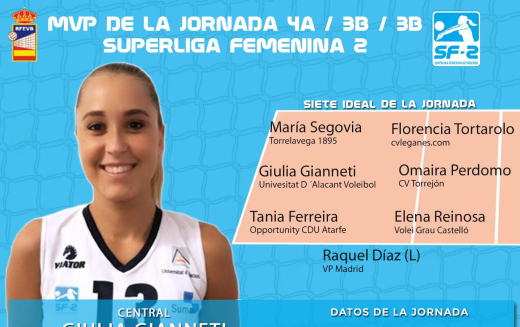 La central de Universitat D´Alacant Giulia Gianneti es la MVP de la pasada jornada en la Superliga Femenina 2. La central transalpina se erigió en la mejor bloqueadora del fin de semana para liderar el tercer triunfo del conjunto universitario y afianzar el liderato del grupo C. Gianneti sumó 21 puntos con 7 bloqueos y 4 saques directos para firmar la actuación más completa de la jornada.