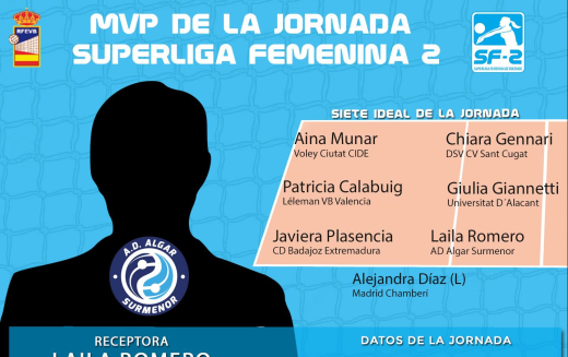 La receptora de AD Algar Surmenor Laila Romero es la MVP de la primera jornada de Superliga Femenina 2. La cartagenera alcanzó la cifra de 26 puntos con 1 saque directo y tres bloqueos para contribuir a la victoria de su equipo en el desempate ante Mairena Vóley Club.