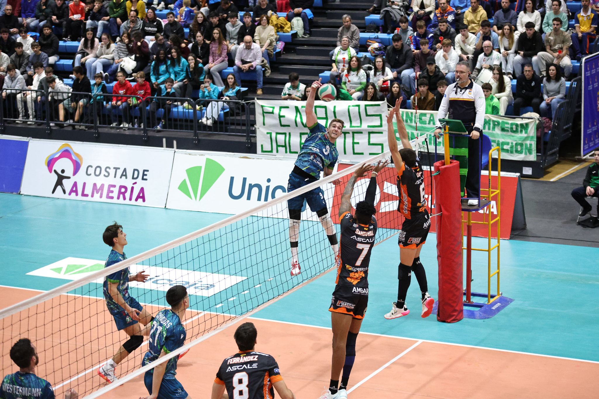 Mintonette Almería, Club Voleibol Vera y Club Deportivo Ulemu de El Ejido arroparon a los verdes en una demostración de unión del voleibol provincial. En pista, dos clubes históricos en los que destacó la juventud. Partido de los que ‘hacen afición’, las niñas y los niños que asistieron salieron del pabellón con una motivación extra para seguir disfrutando del vóley. Unicaja Costa de Almería tuvo a Mario García y Joaquín Cañadas en el equipo titular ante las bajas de Fran Iribarne, Miko Räsänen y Jorge Fernández. Por parte turolense, decisivo fue su opuesto de 19 años, Germán Gómez. Tan es así que anotó 27 puntos, seguido por su compañero, el exahorrador David López, con 23, autor de 10 bloqueos.