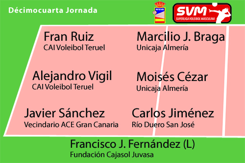 El mejor bloqueador de la jornada volvió a ser Alejandro Vigil, de CAI Voleibol Teruel. El central del conjunto aragonés, que ya lideró la lista de bloqueadores del fin de semana pasado, registró una nueva brillante contribución en el centro de la red al conectar 6 bloqueos y 10 puntos en la victoria de su equipo, por lo que nuevamente se gana un puesto entre los destacados de la jornada. El otro central del siete ideal de la fecha 14 es Moisés Cézar, de Unicaja Almería, que sumó 5 bloqueos y 6 puntos ante el conjunto ibicenco.