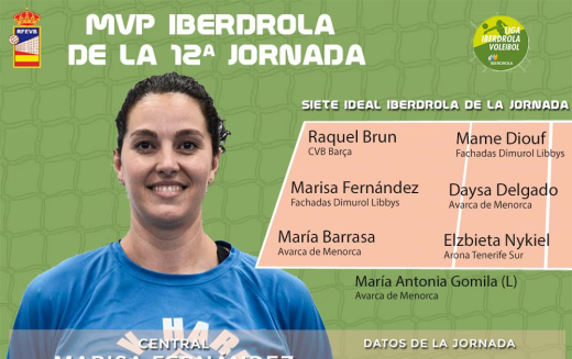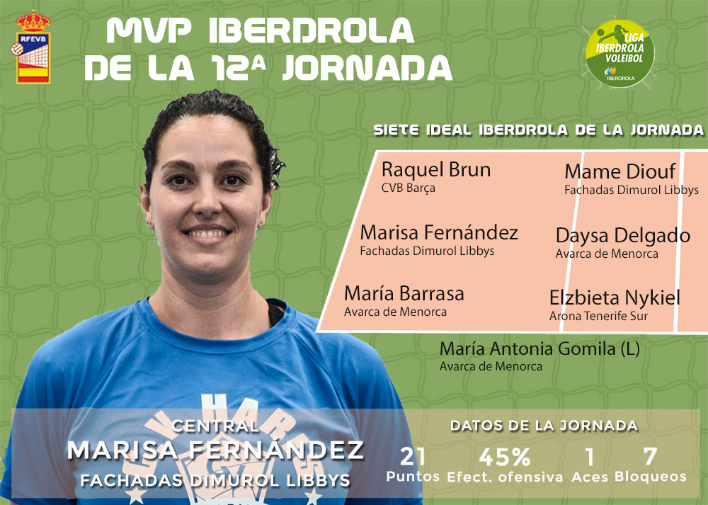La jugadora de Fachadas Dimurol Libbys Marisa Fernández se lleva el MVP Iberdrola de la primera jornada del año en la división de honor femenina. La fecha 12 de la Liga Iberdrola estuvo marcada por un apasionante duelo de rivalidad regional entre Fachadas Dimurol Libbys y Arona Tenerife Sur, partido que terminó con triunfo de las primeras 2-3 en un encuentro en el que brilló la central sevillana.
