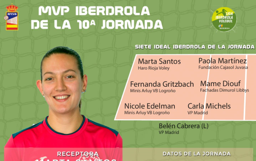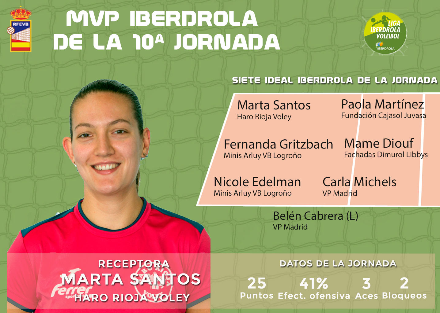 El MVP Iberdrola de la última jornada del año en la División de Honor femenina recae en la jugadora de Haro Rioja Voley Marta Santos. La atacante fue la principal responsable de la victoria de su equipo sobre Fundación Cajasol Juvasa, en el partido más disputado de la fecha 11 de la Liga Iberdrola.