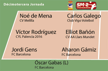 Acompañando a Gens en el siete ideal de la jornada aparecen otros dos jugadores de FC Barcelona. Óscar Gabas encabeza la lista de líberos mientras que Aharon Gámiz fue otro de los destacados de la jornada al completar 18 puntos, 15 de ellos de ataque, además de 87% en recepción, 1 ace y 2 bloqueos en el triunfo sobre CV Melilla.