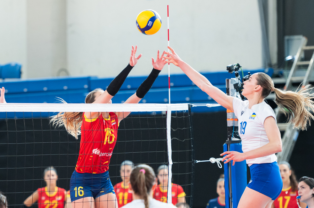 Un ciclón llamado Ucrania dominó el inicio del encuentro, conquistando cinco puntos de renta que Pascual Saurín intentó frenar con un tiempo muerto. Las Leonas regresaron a pista con más calma y más focalizadas en su juego. Dos acciones de María Segura y un bloqueo de Schlegel acercaban a España, pero la presión ucraniana con el saque devolvió los cinco de renta, cuando el técnico español agotaba sus tiempos muertos (18-13). El saque de Dymar atascó al equipo nacional que terminó cediendo por 25-16