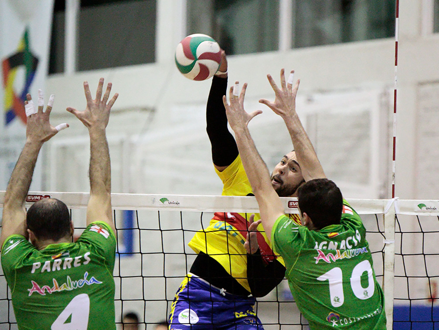 Partido apasionante el vivido en la noche del sábado en el Moisés Ruiz, con las luchas por ser cabeza de serie y por entrar en play off mezclándose en el duelo entre Unicaja Almería y Ushuaïa Ibiza Voley.