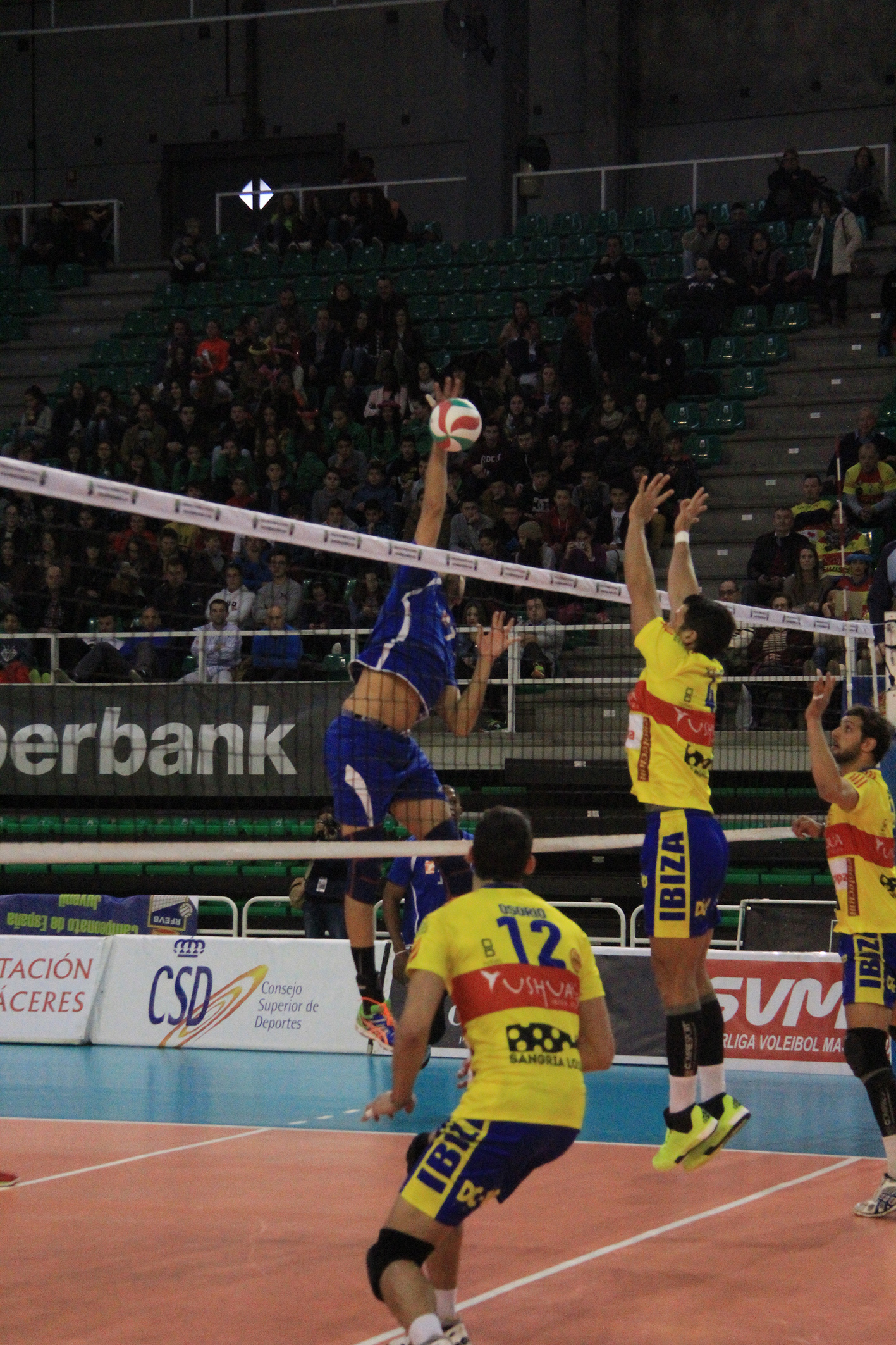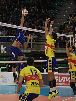 CV Melilla - Ushuaïa Ibiza Vóley Gerard Osorio finta sobre el bloqueo melillense